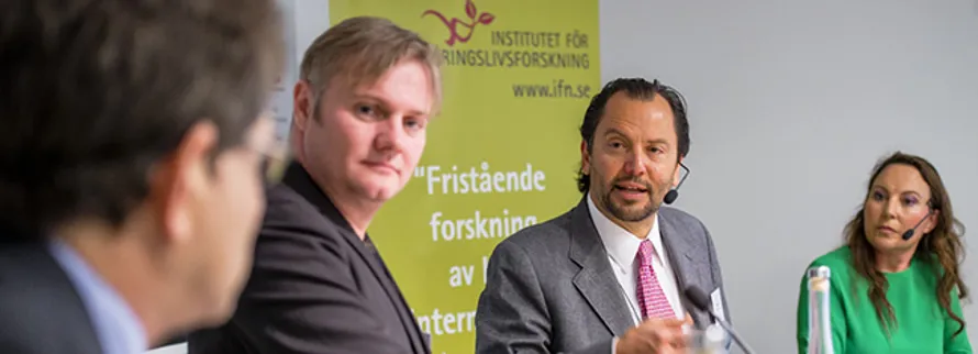 In the picture from right: Cecilia Garme (moderator), Luigi Zingales, Christian Bjørnskov and Magnus Henrekson. Photo: Karl Gabor.